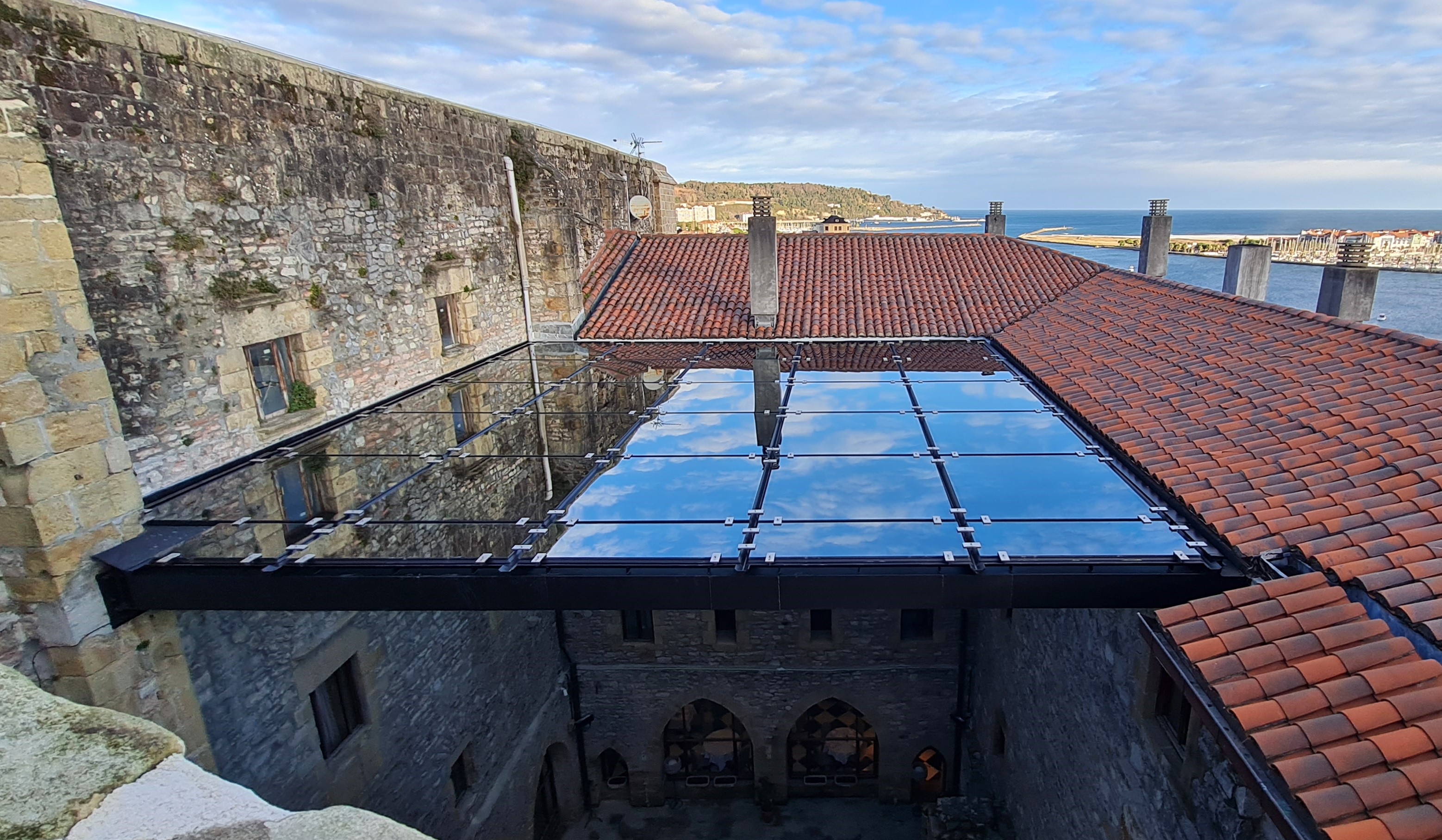 Acristalamiento del lucernario del patio interior del parador de Carlos V sobre estructura de hierro.