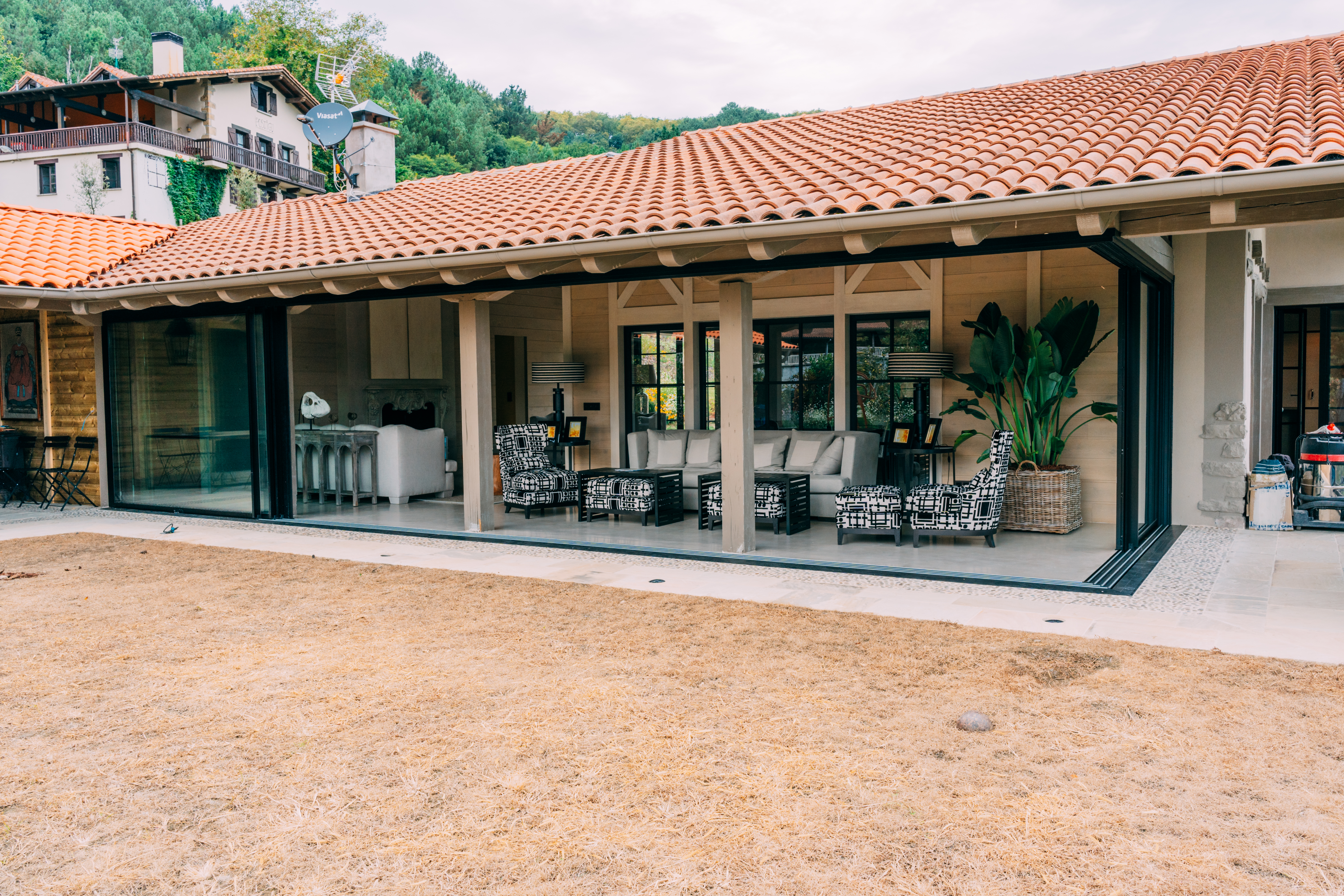 Cerramiento de chill-out mediante ventana corredera de 4 carriles en esquina; para una apertura completa, convirtiendo el espacio interior en exterior.